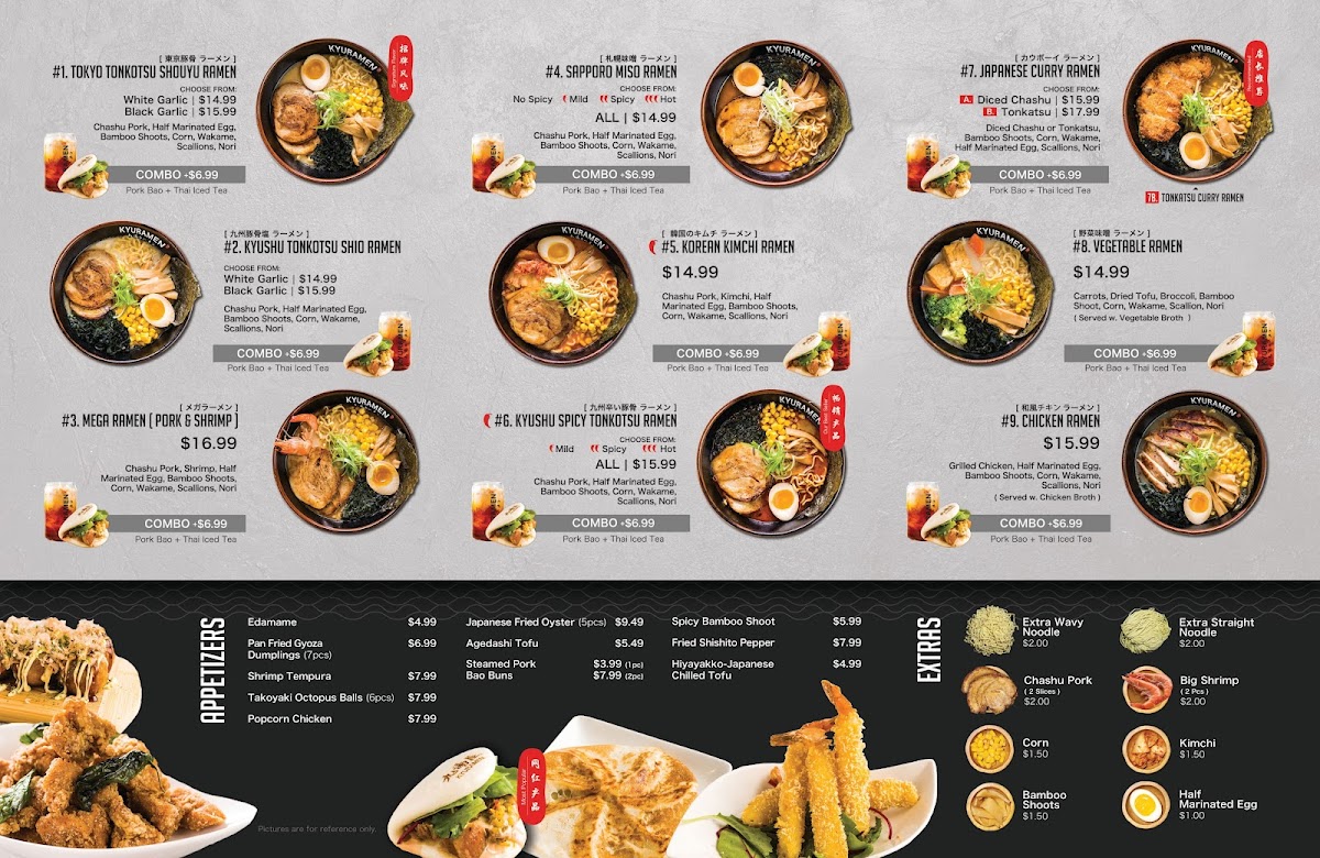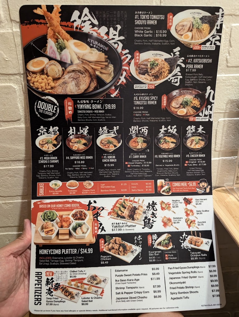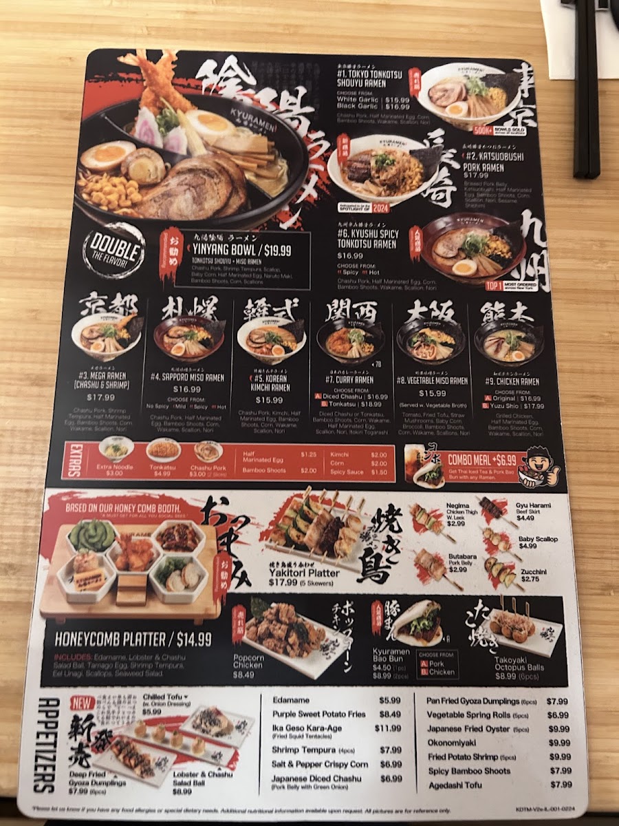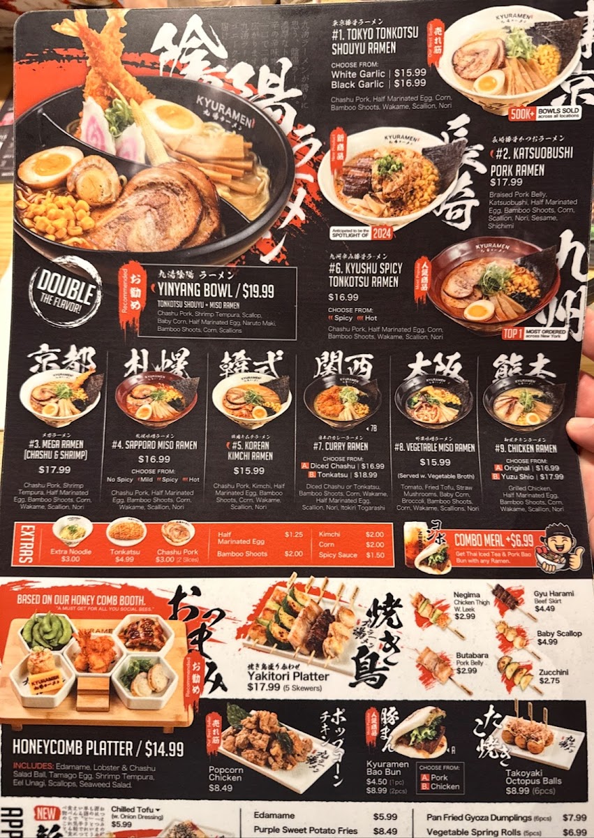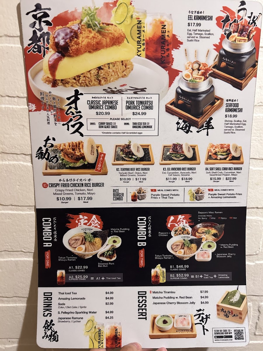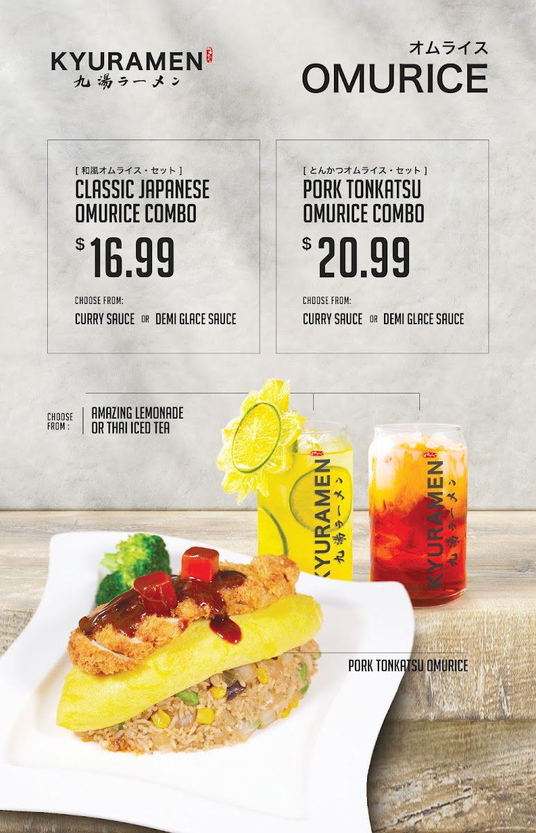 Combo includes: kyushu tonkotsu shio ramen sapporo miso ramen popcorn chicken japanese cherry blossom jelly matcha pudding w. red bean Thai Iced Tea Amazing Lemonade